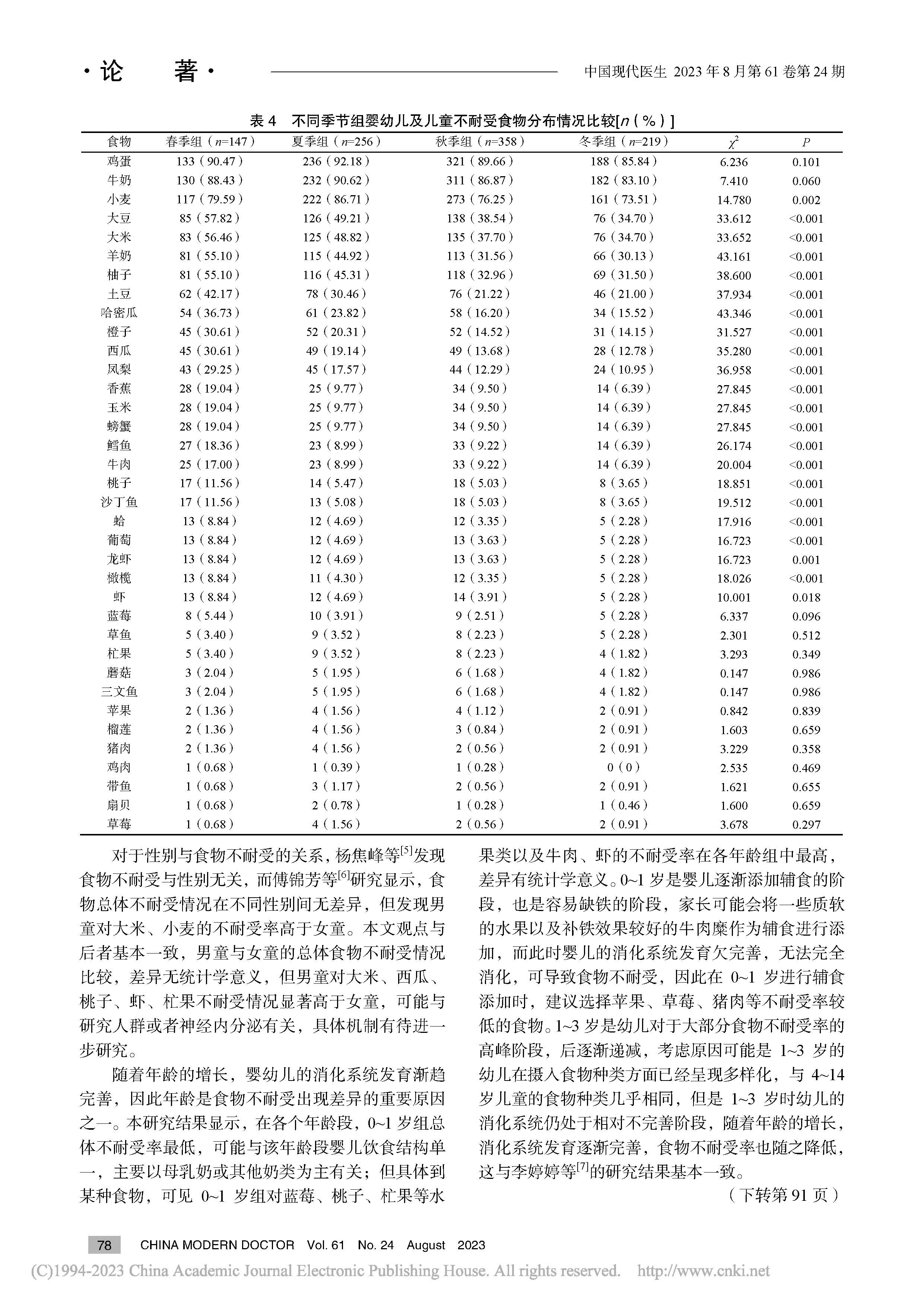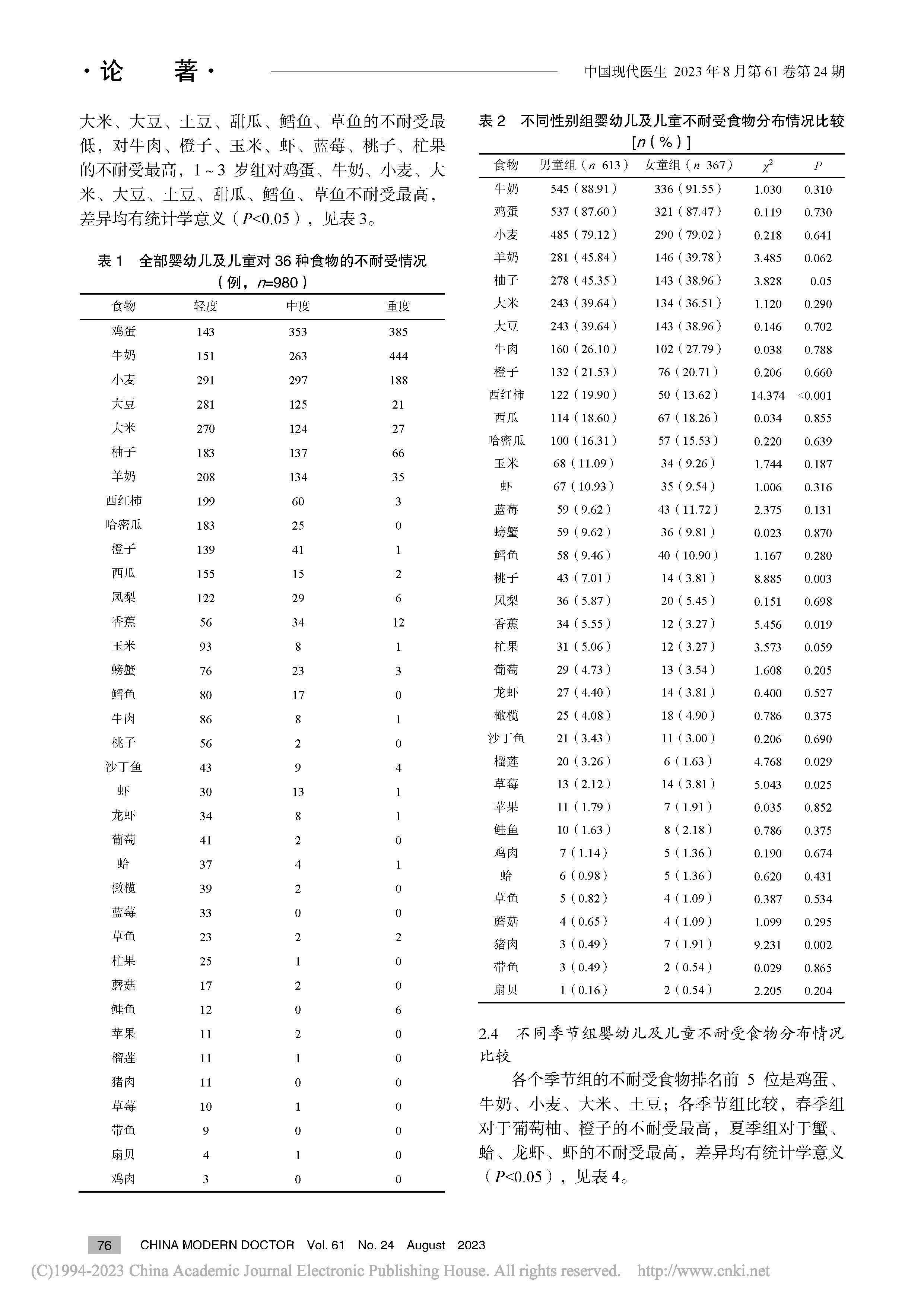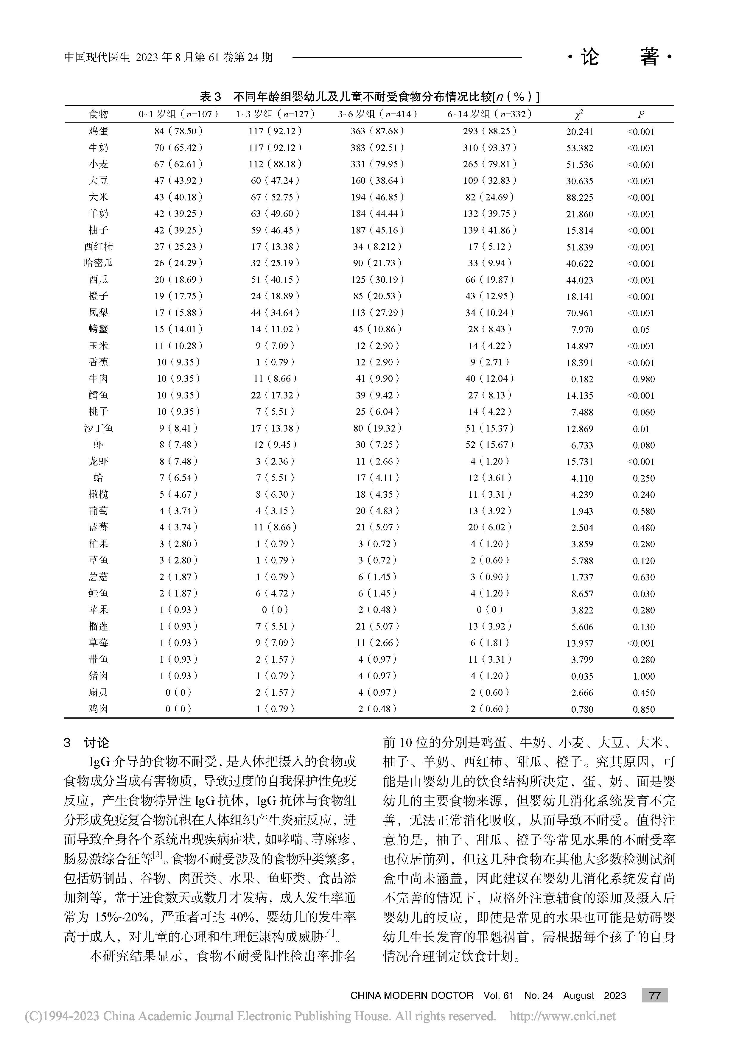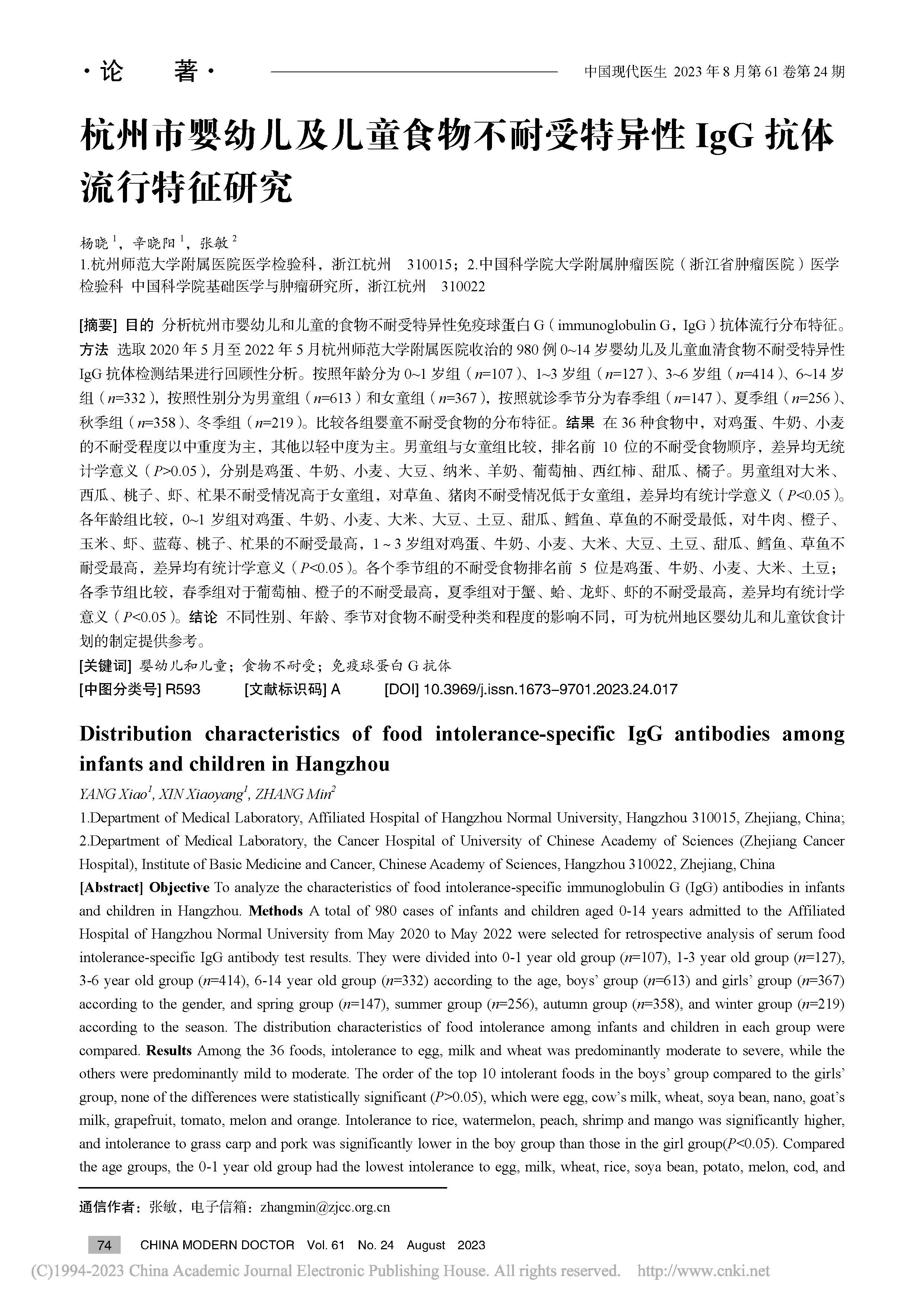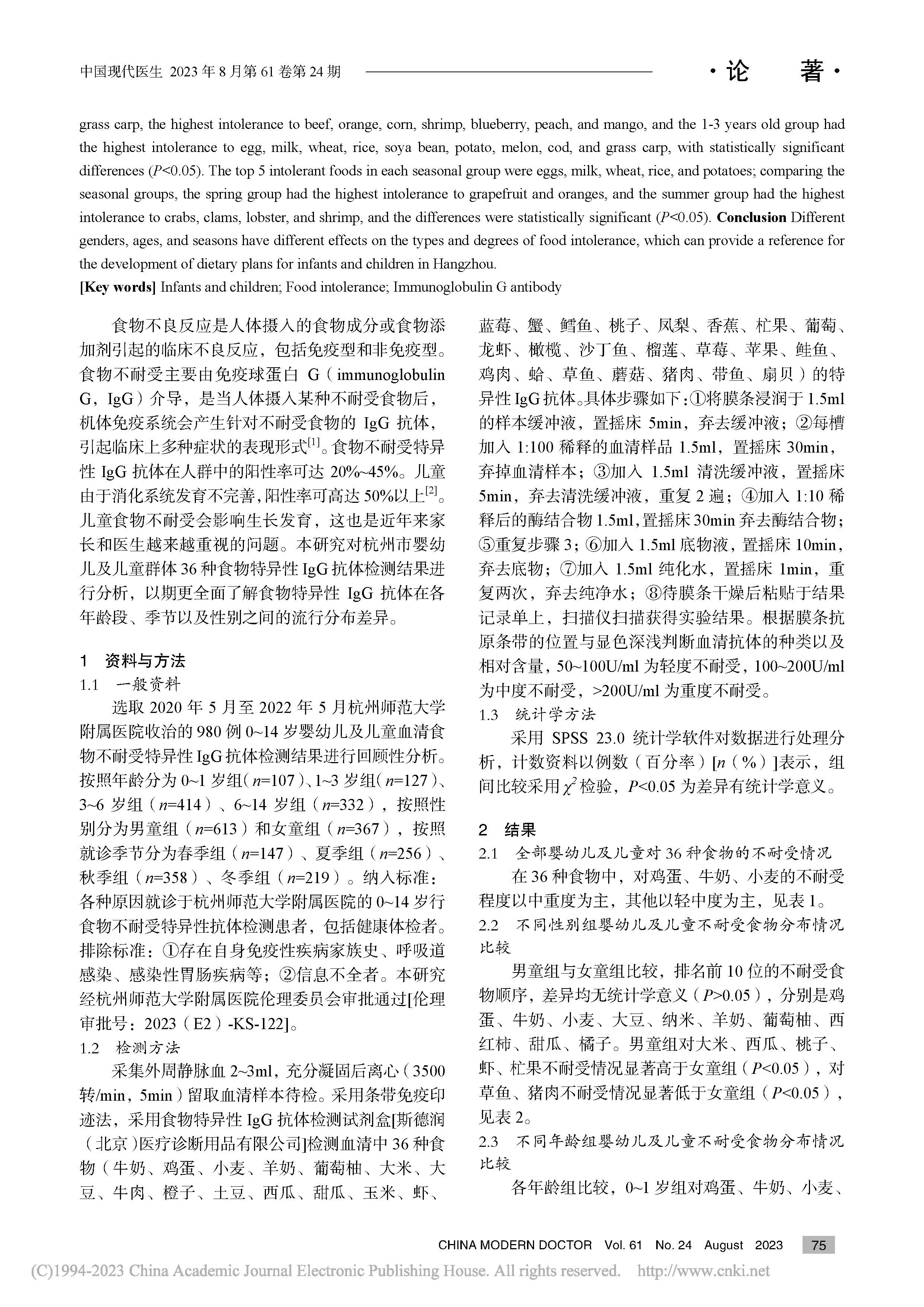杭州市婴幼儿及儿童食物不耐受特异性IgG抗体流行特征研究