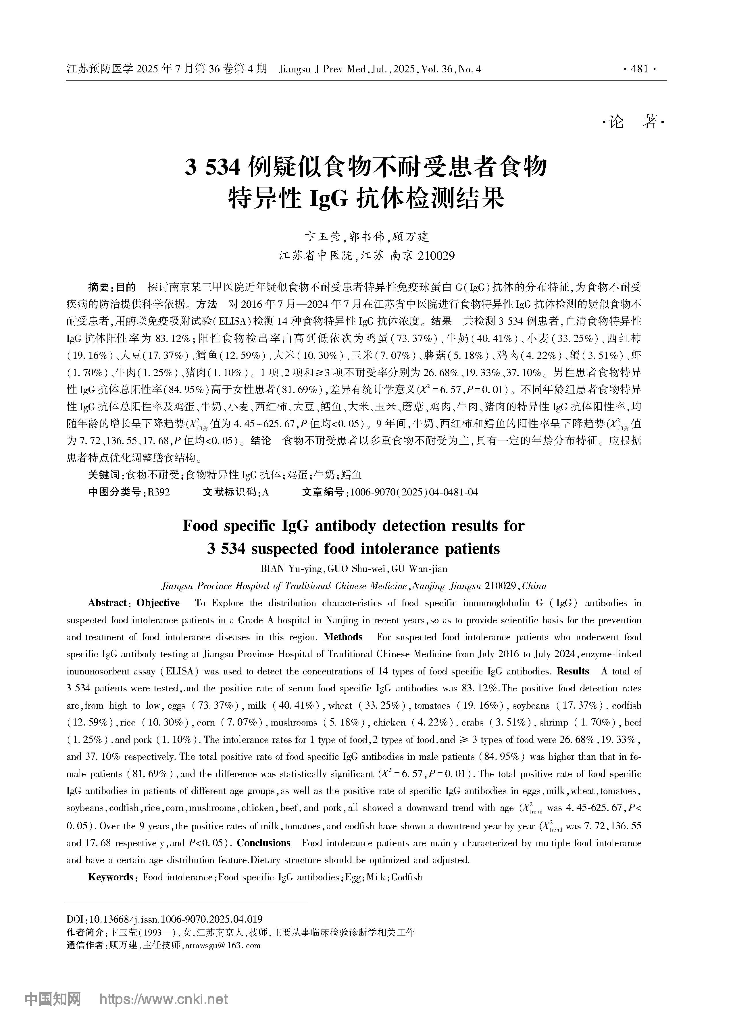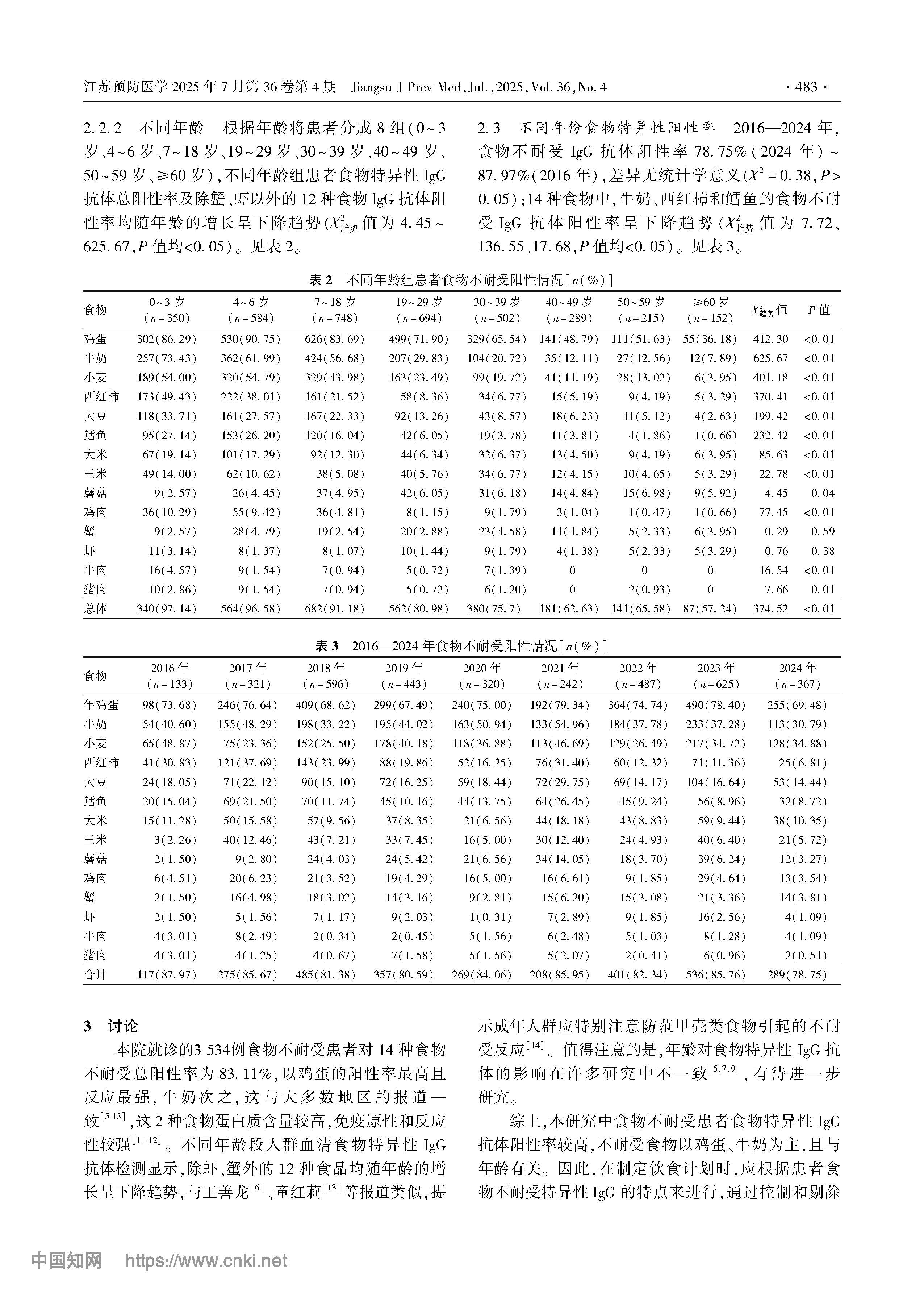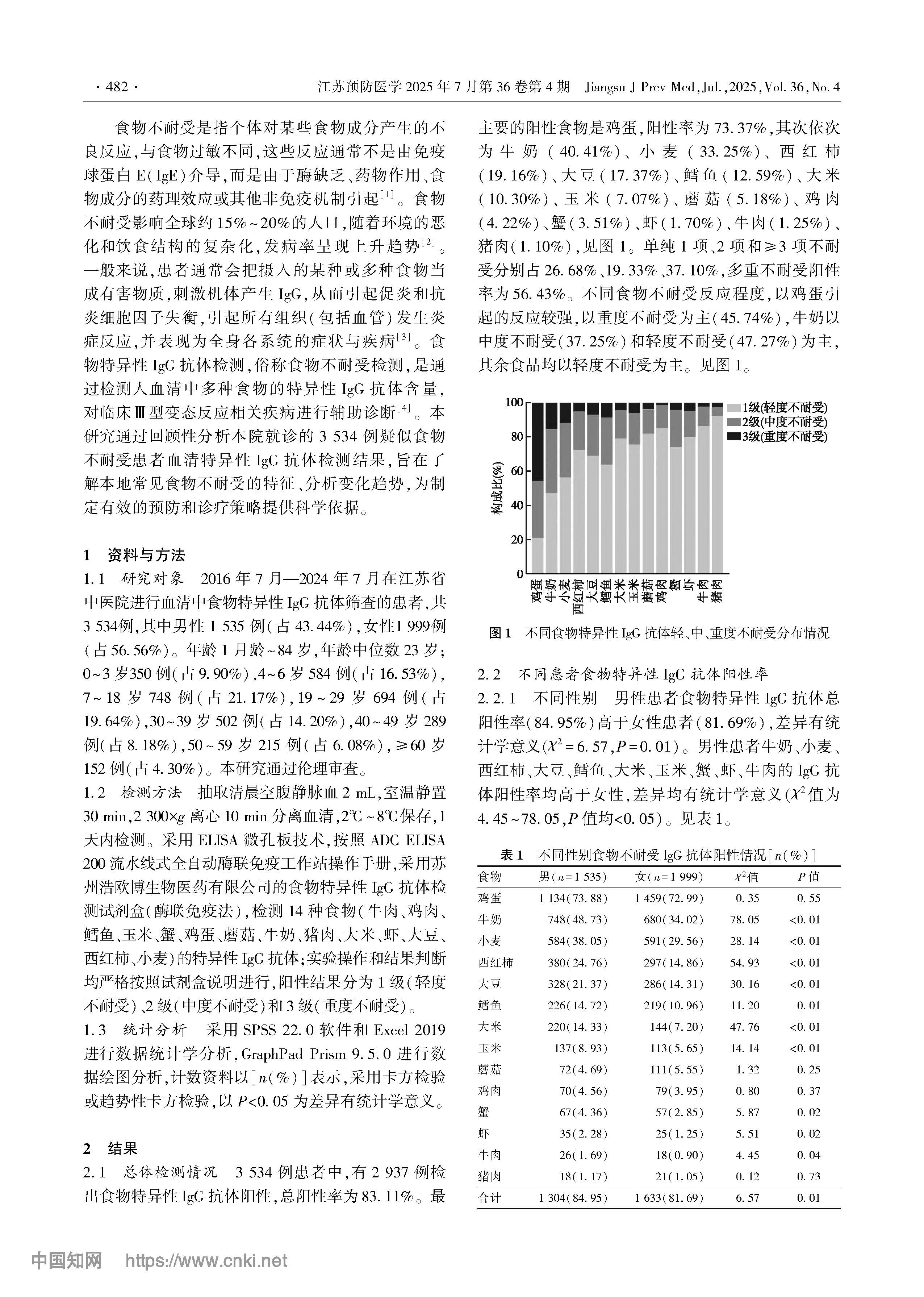 3534例疑似食物不耐受患者食物特异性IgG抗体检测结果